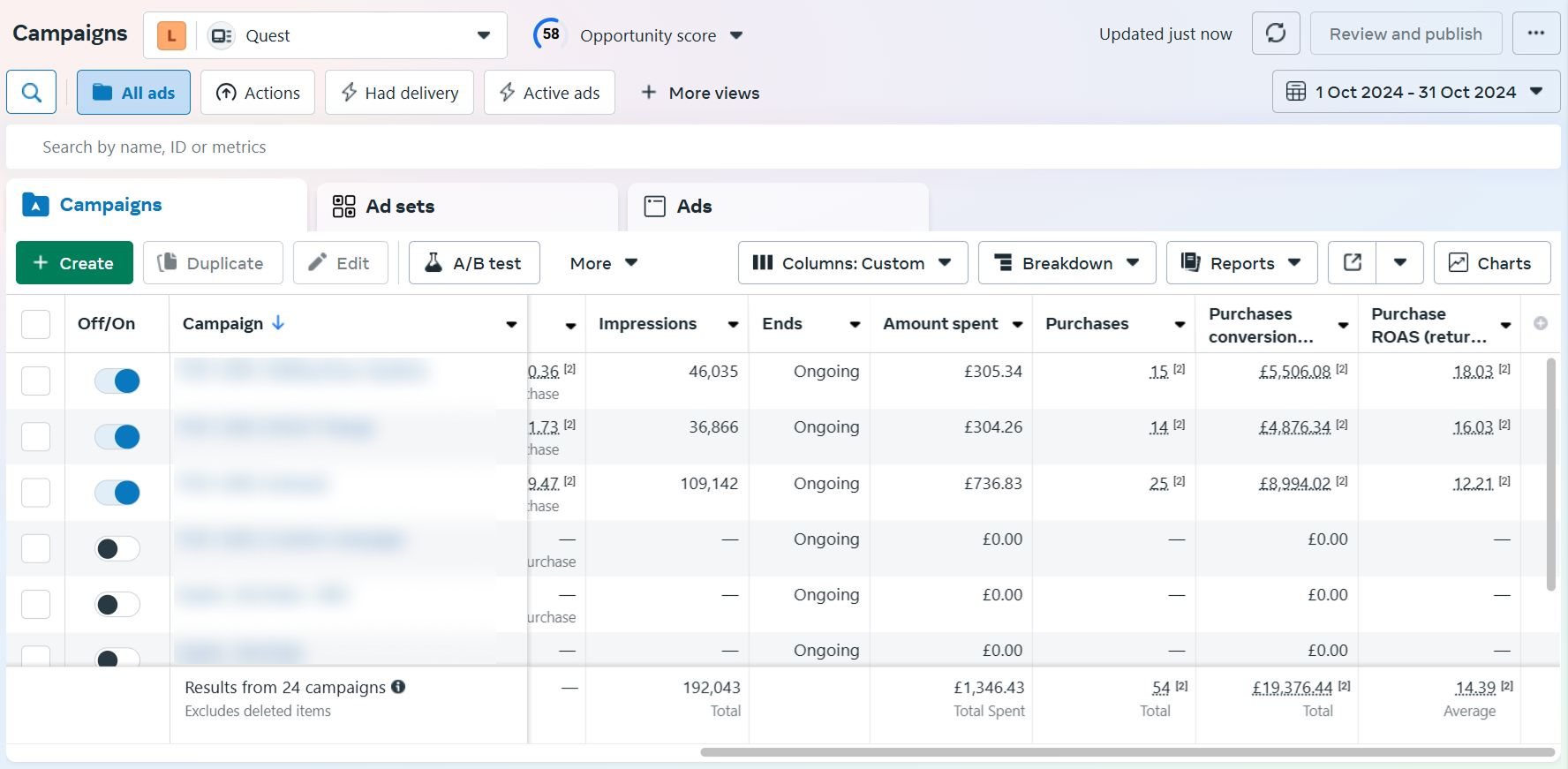 In the very first month of implementation of our Meta Ads strategy for Quest, we generated an additional £19,376.44 in revenue from just £1,346.43 in ad spend, delivering an impressive 1,439% return on ad spend (ROAS). The strongest results came from campaigns using Dynamic Creative Technology (DCT) and LED product bundle promotions.
