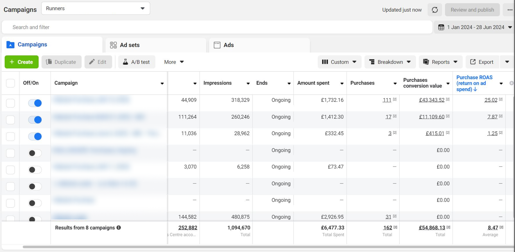In just 6 months, we achieved a total of £54,868.13 in purchase conversion value from just £6,477.33 in ad spend, delivering an impressive 8.47x ROAS across all campaigns. Targeted audience segmentation, dynamic creative testing, and precise budget optimisation significantly contributed to the campaign's success. With our data-driven approach and precise strategy execution, Runners UK's paid social activity was transformed from a chaotic, inconsistent channel into a predictable and profitable revenue source.